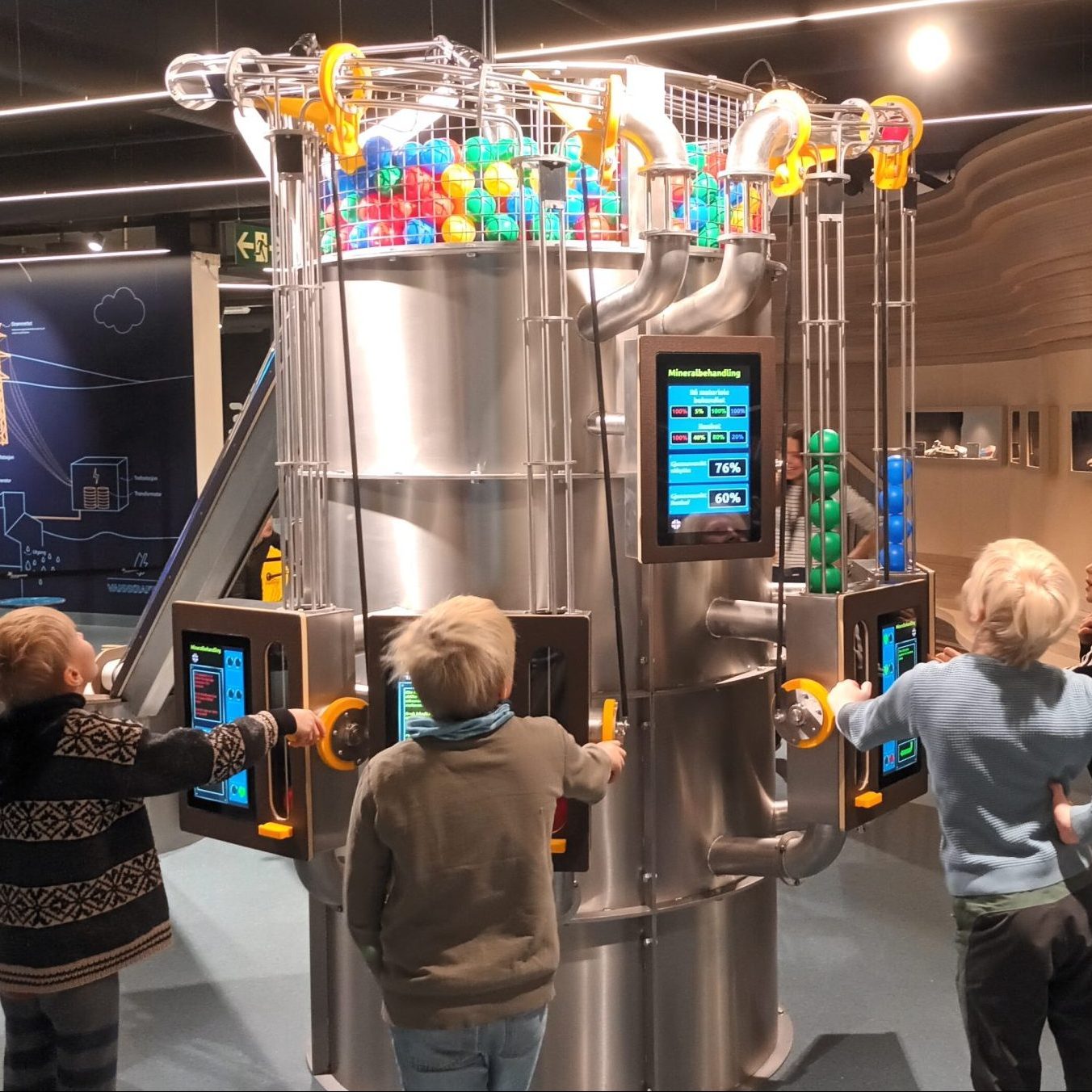 Visitors ‘mine’ ore (mixed coloured balls) with two excavators, unloading them onto a filter that removes unwanted rock (white balls). Visitors work belt and screw conveyors to load the ore into a tall separator machine.