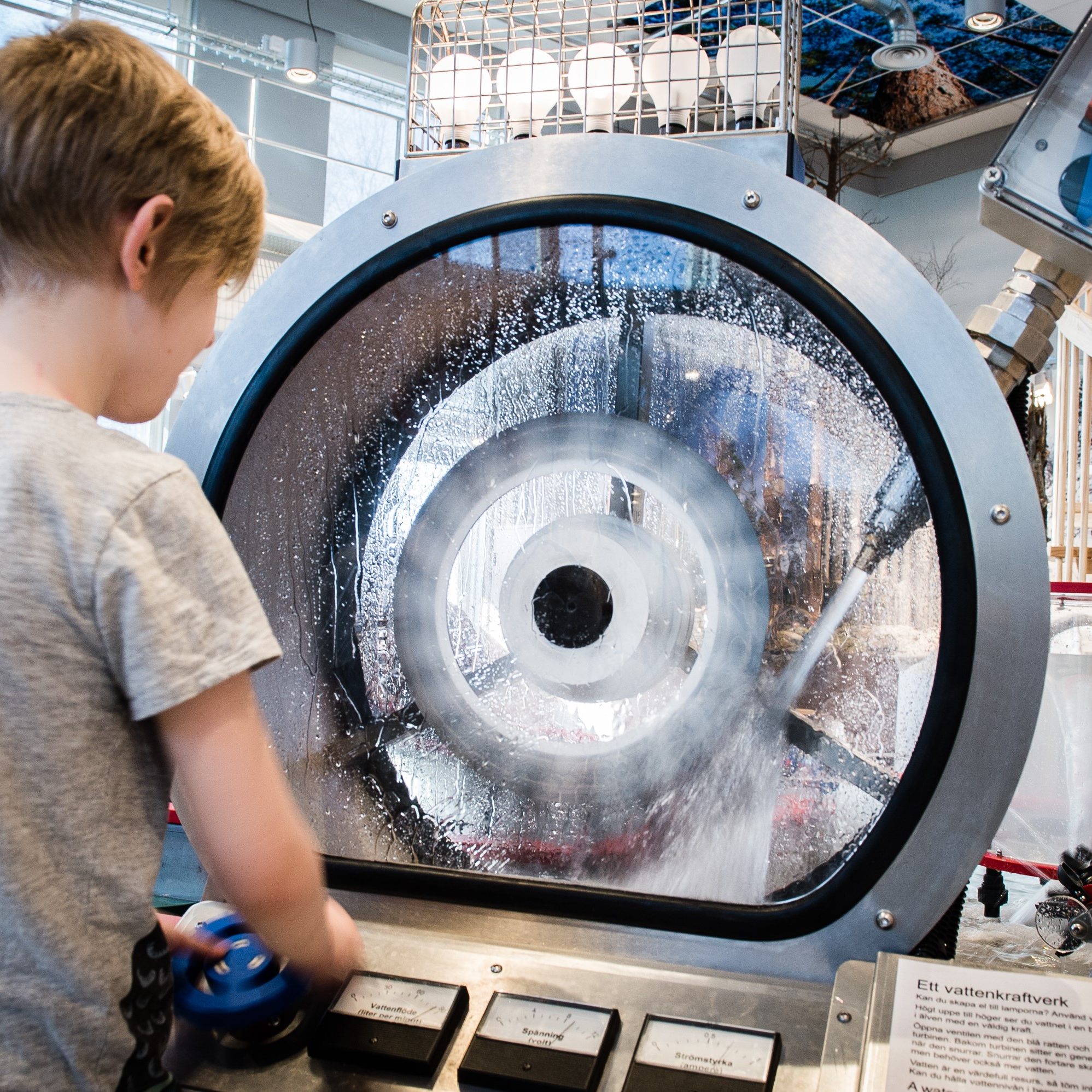 The exhibit consists of one large ‘V’-shaped tank and waterfall that has several distinct interactive areas and activities that relate to principles of water energy – shown in practice with a pelton turbine driven by the water flow and powering the lights above it.